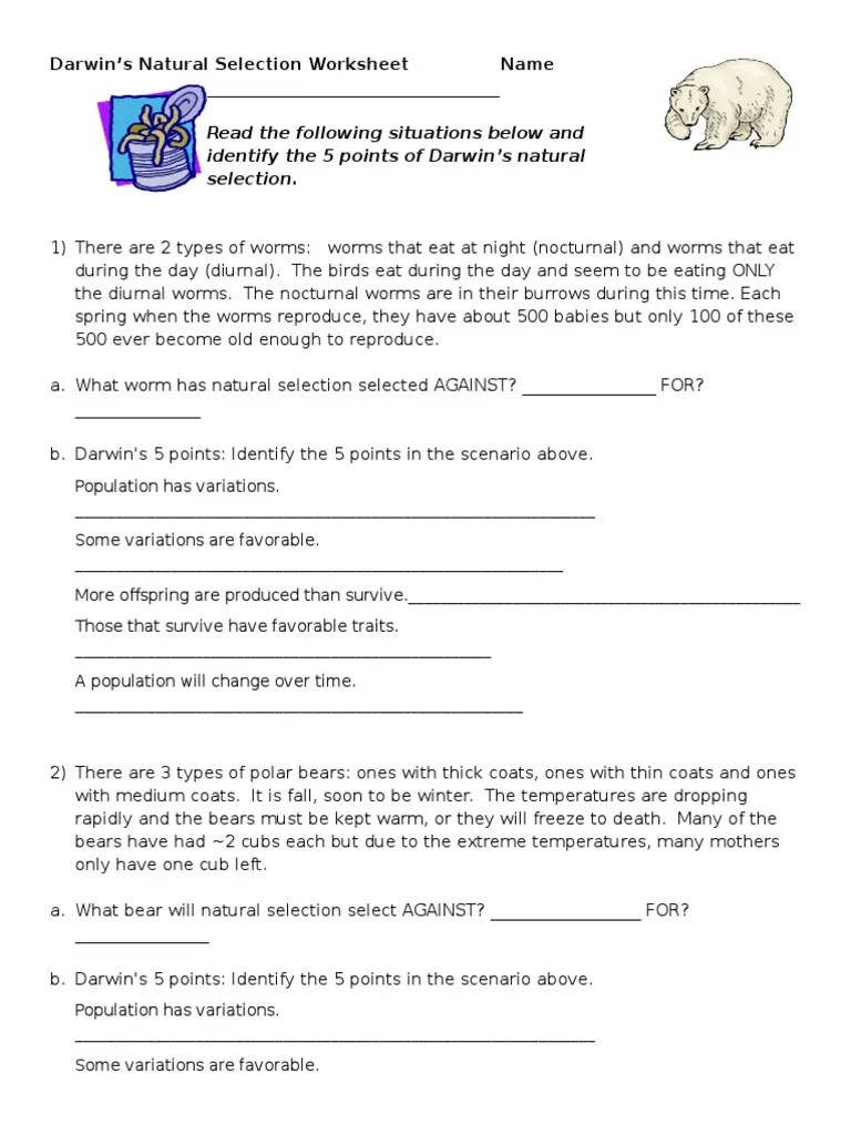 What mechanism(s) account for the fact of evolution? Read the following situations below and identify points of darwin's natural selection. Read the following situations below and identify the 5 . You will receive your score and answers at the end. Darwin's natural selection worksheet answers. Students thought about this might and wrote an answer over an index card. Become old enough to reproduce. Worms that eat at night (nocturnal) . 5 points of darwin's natural selection. Darwins natural selection worksheet name. Survival of the fittest really . Each spring when the worms reproduce, they have about 500 babies but only 100 of these 500 ever become old enough to reproduce. What worm has natural selection selected against?